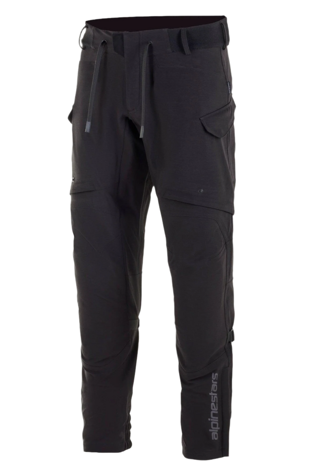 Alpinestars Juggernaut Waterproof Pants, Motorcycle Pants, Black, featuring a drawstring waist and elasticated waistband, zippered cargo pockets on the thighs, vertical Alpinestars logo on the lower leg, casually-styled softshell textile construction
