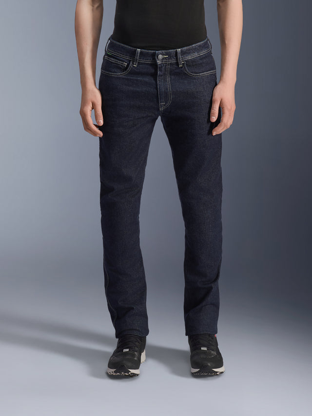 Skyddande motorcykeljeans i denim, uppdaterade med förfinade detaljer.