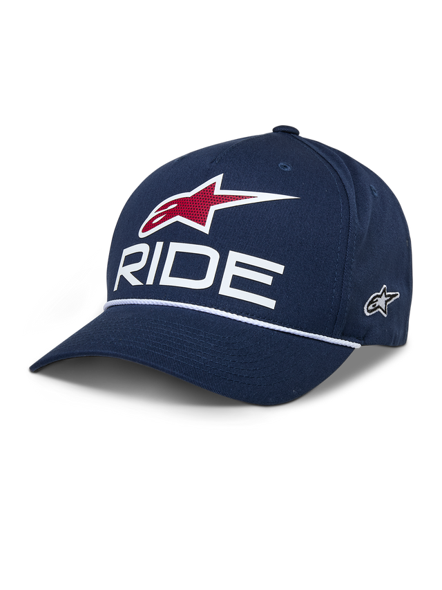 • Astars Ride-logotyp i 3D-tryck framtill, sidologotyp med platt broderi och flätad repkant