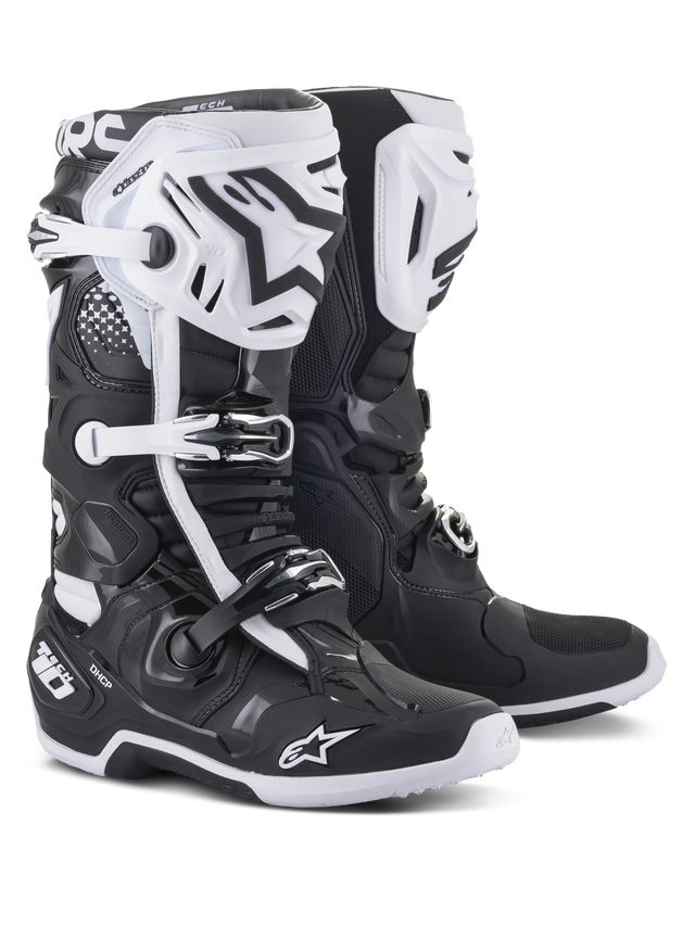 Dubbeldensitets TPU‑bakbladssystem konstruerat för att förhindra översträckning samtidigt som det ger förbättrad flexkontroll och stötdämpning. Integrerat i Tech 10:s unika och lätta enstyckskonstruktion med saminjekterad fotdel finns det patenterade Dynamic Heel Compression Protector (DHCP), en innovativ säkerhetsfunktion som inkluderar ett fullt integrerat, kollapsbart hälområde med expanderat poly-skum för att absorbera höga stötenergier vid en krasch. DHCP har ett riktat stötskyddssystem som avsevärt minskar effekten av överdriven, potentiellt skadlig energi som överförs till vrist och underben. DHCP har använts av Alpinestars idrottare i de krävande miljöerna inom professionell Supercross och Motocross.