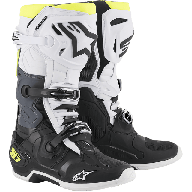 Dubbeldensitets TPU‑bakbladssystem konstruerat för att förhindra hyperextension samtidigt som det erbjuder förbättrad flexkontroll och slagmotstånd. Inbyggt i Tech 10:s unika och lätta enstycks‑samgjutna fotkonstruktion finns det patenterade Dynamic Heel Compression Protector (DHCP), en innovativ säkerhetsfunktion som inkluderar ett fullt integrerat kollapsbart hälområde med expanderat polyskum för att absorbera höga stötenergier vid en krasch. DHCP har ett riktat stötskyddssystem som avsevärt minskar effekten av överdriven och potentiellt skadlig energi som överförs till fotleden och underbenet. DHCP har använts av Alpinestars idrottare i de krävande miljöerna inom professionell Supercross och Motocross.
