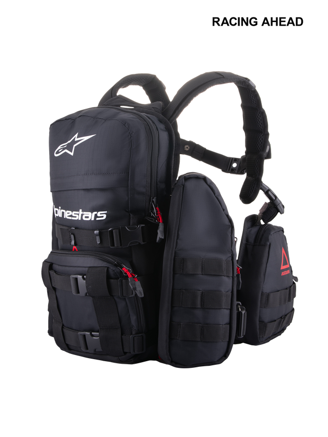 Ergonomiska axelremmar med perforerad skumvaddering och meshpaneler för optimerat luftflöde, justerbart och avtagbart bröstband och Alpinestars magnetiska bröstspänne för en snabb och säker justering.